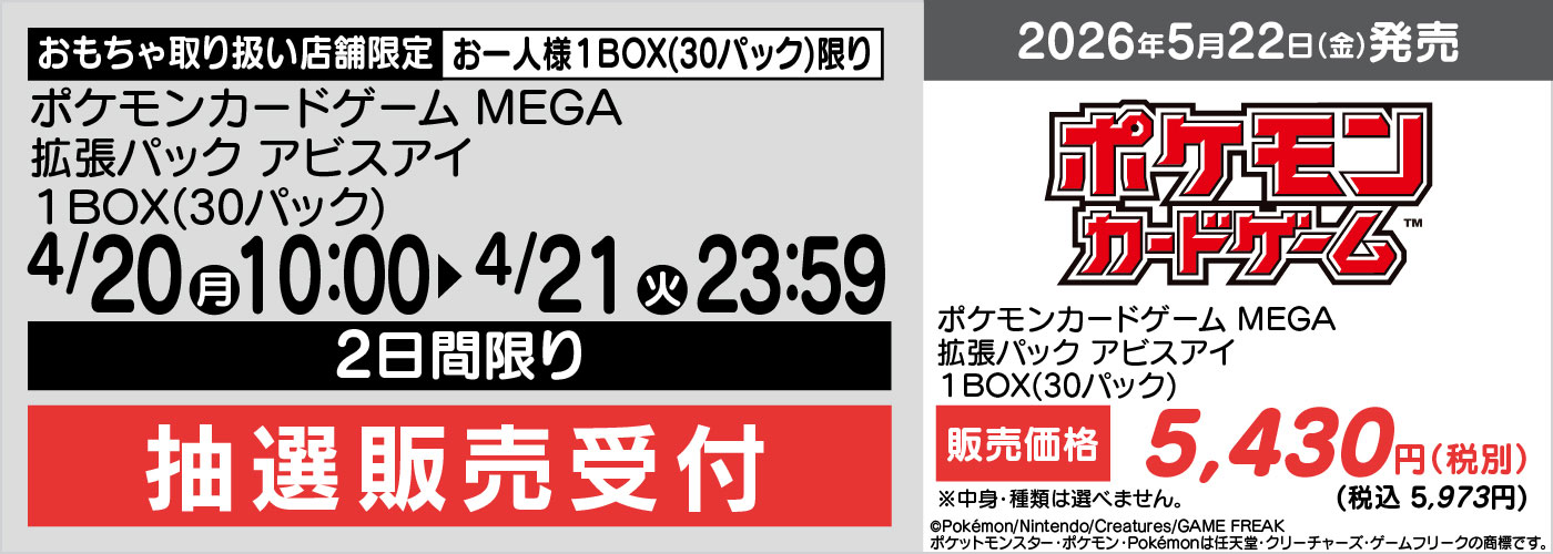 ポケモンカードゲーム MEGA 「拡張パック アビスアイ」が買えるようになる抽選となっています。