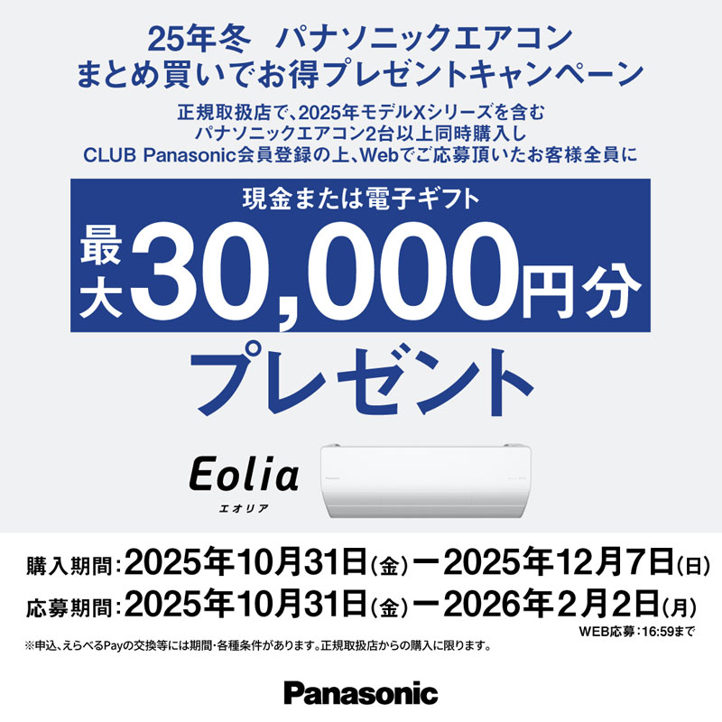 25年冬パナソニックエアコンまとめ買いでお得プレゼント