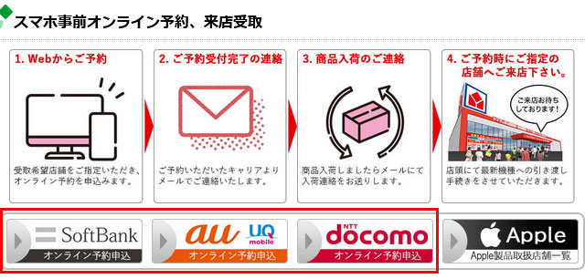 ご予約を希望のお客様はページ下部「Android製品取扱店舗」より最寄りの店舗を選択して下さい。少しスクロールすると「スマホ事前オンライン予約、来店受取」メニューが表示されますのでご希望の通信キャリアを選択して下さい。
