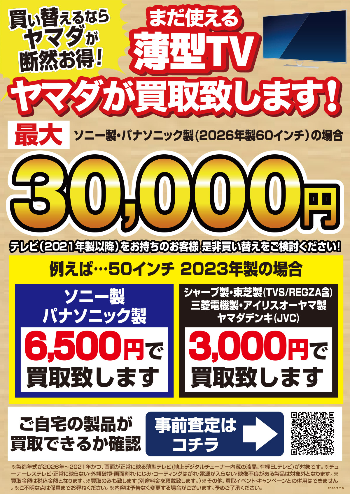 | 薄型テレビ | ソニー製、パナソニック製、シャープ製、東芝製(TVS REGZA含む)、三菱電機製、アイリスオーヤマ製、ヤマダデンキ(JVS) | 2021年製 ~ 2026年製 |