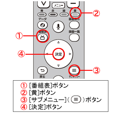 - リモコンの[番組表]ボタンを押して番組表を表示し、サブメニュー(