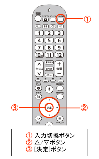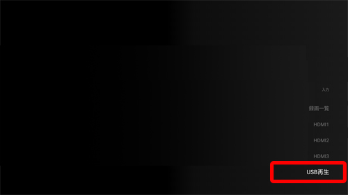 ボタンでUSB再生を選び、[決定]ボタンを押します。- 保存されたコンテンツの一覧が表示されますので、再生するコンテンツを選択し、[決定]ボタンを押します。
