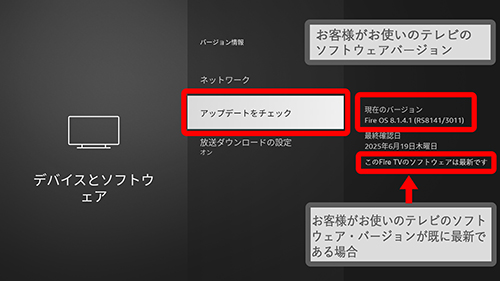 ・下図の通り、「このFire TVソフトのソフトウェアは最新です」を確認します。※最新でなければ、「ソフトウェアバージョンの更新方法」の手順 4. から実施します。