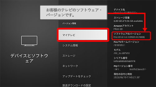 ③表示された「マイテレビ」にカーソルを合わせ、右側に表示される[ソフトウェアのバージョン]で確認することができます。